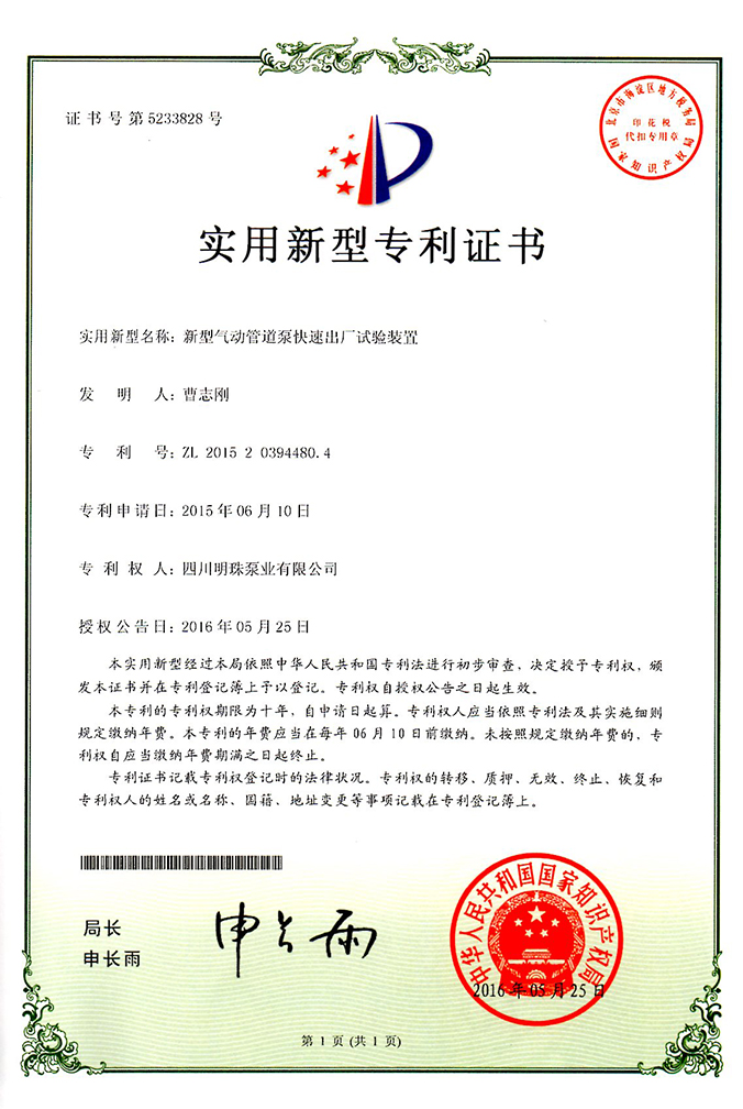 《新型氣動管道泵快速出廠試驗裝置》實用新型專利證書