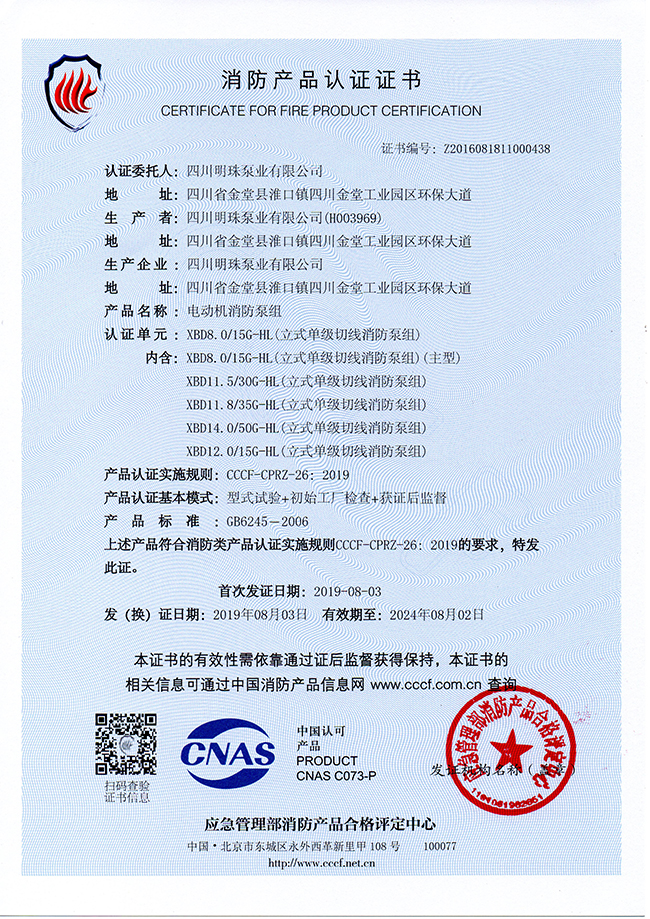 XBD-HL消防產(chǎn)品認(rèn)證證書