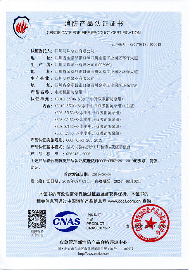 XBD-S消防產(chǎn)品認(rèn)證證書