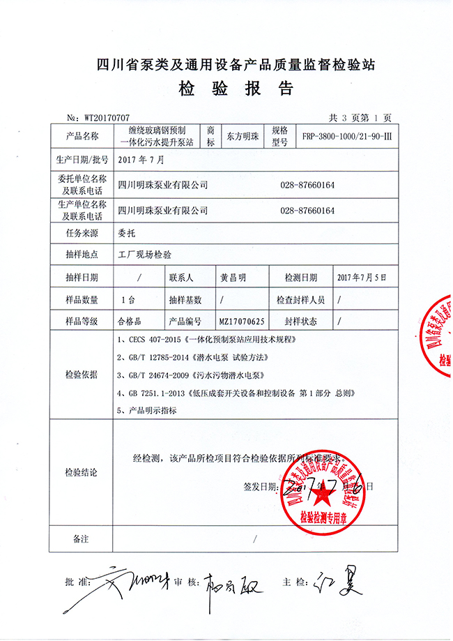 FPR玻璃鋼一體化預(yù)制泵站檢驗(yàn)報(bào)告