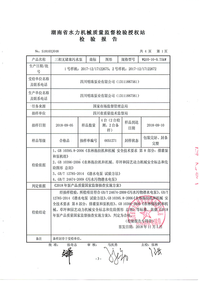WQ三相無堵塞污水泵省質(zhì)量監(jiān)督檢驗(yàn)報(bào)告